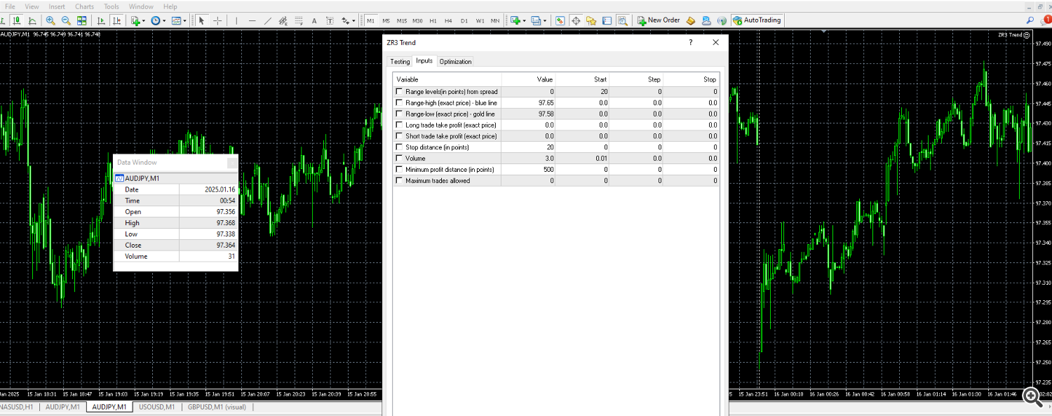 This is an instance of utilizing the ea on a AUDJPY chart. Mt4 technique tester with Coinexx beginning at 2025.01.16. I modified the primary setting, vary ranges, to 0 and set range-high to 97.650 and range-low to 97.580, primarily based on yesterday’s ranges. Lengthy and brief revenue targets left at 0 with a cease distance of 20 factors. Quantity is 3.00 heaps, minimal revenue distance is 500 factors, and no most variety of trades is ready.