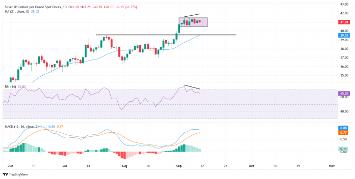 From a technical perspective, Silver has been consolidating inside a good $41.50–$40.50 vary since early September. On the day by day chart, a bearish divergence on the Relative Power Index (RSI) factors to fading upside momentum, whereas the flattening Shifting Common Convergence Divergence (MACD) histogram indicators weakening bullish strain.