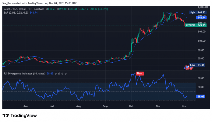 ZEC/USD sits close to $349.15 on the chart, retracing closely from its $744 peak and transferring steadily beneath the Parabolic SAR markers that proceed to replicate a bearish tone. The general circulation of value motion stays downward, with constant decrease highs and decrease lows shaping sentiment. For any upside shift to take type, ZEC would wish to problem and clear resistance ranges round $400, $470, and $550—zones the place prior rallies misplaced momentum and sellers reasserted management.